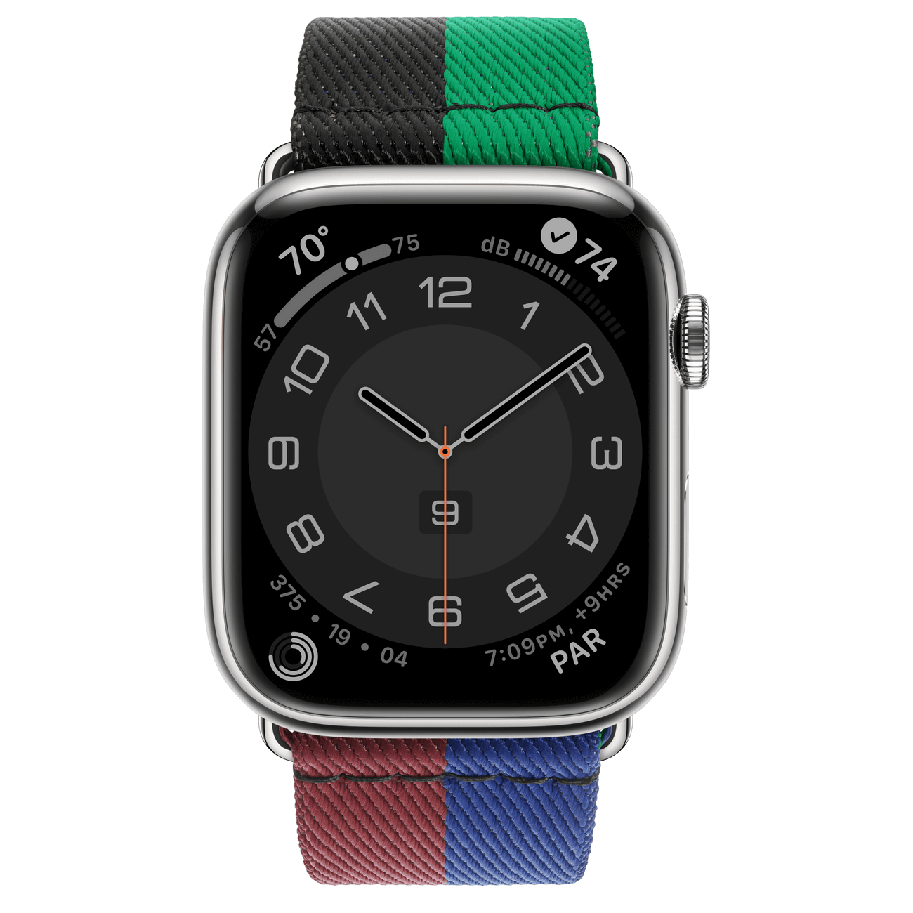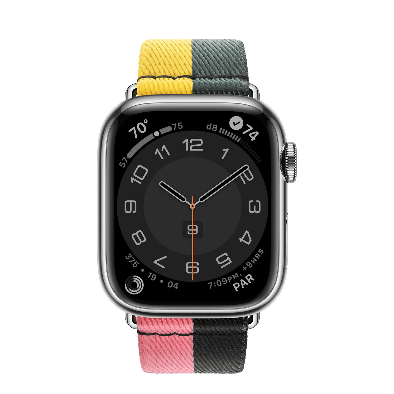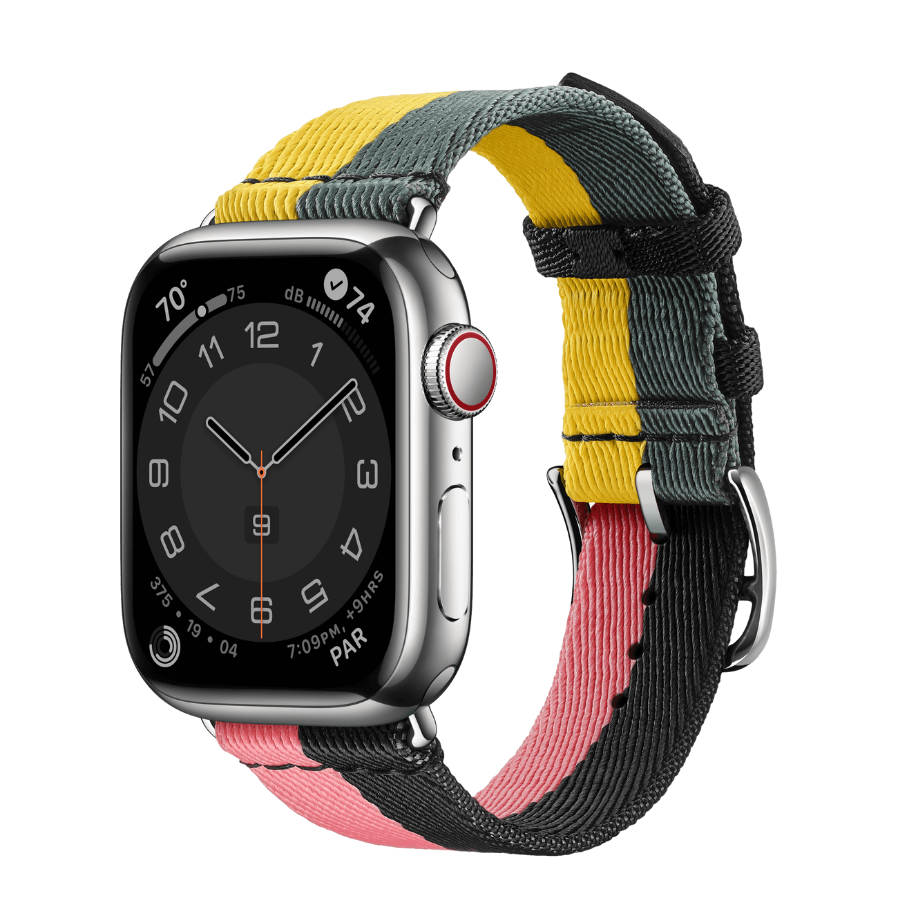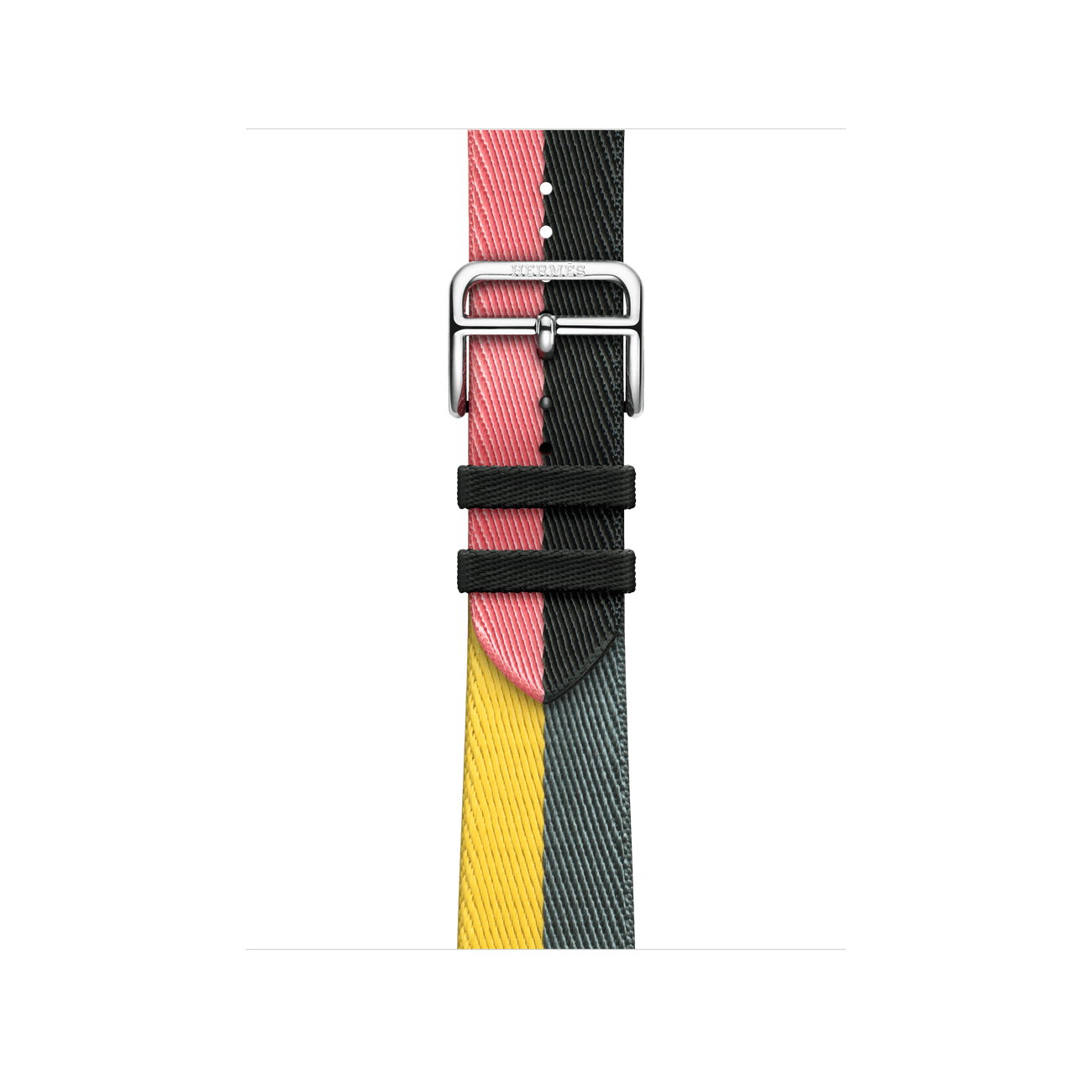 The stainless steel case is durable and polished to a shiny. mirror-like finish. The Casaque Single Tour is crafted from woven nylon in a sporty color-blocked design with a stainless steel buckle.
